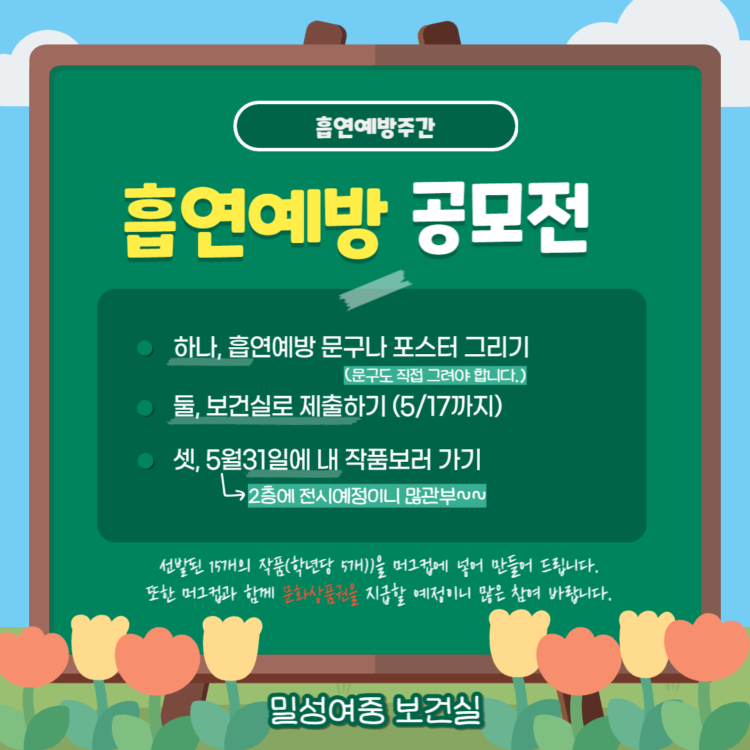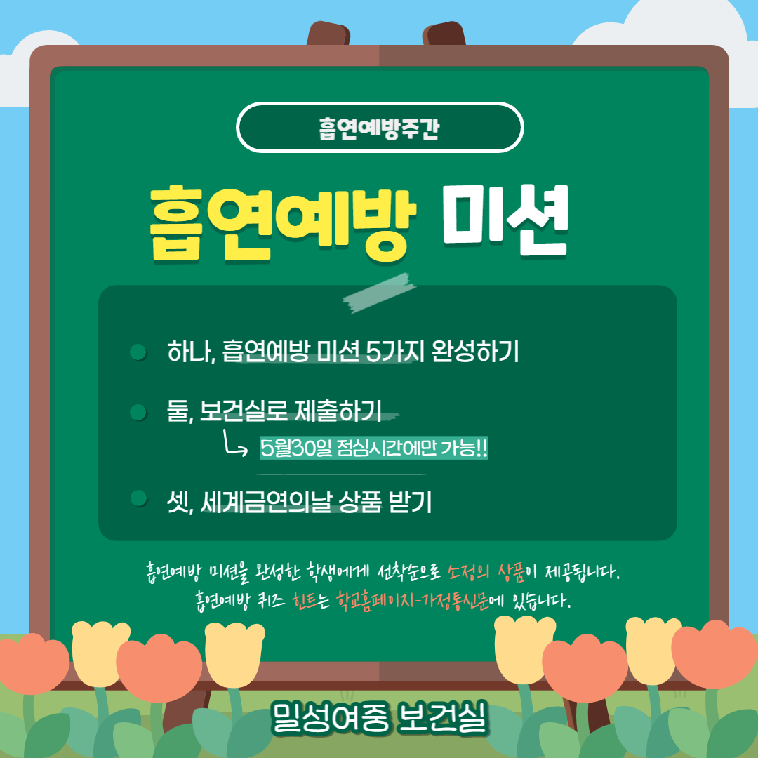 세계금연의 날을 맞아 학교에서 흡연예방주간을 운영하고자 합니다. 학생과 학부모님의 많은 관심바랍니다. (미션종이는 각반에 배부함)